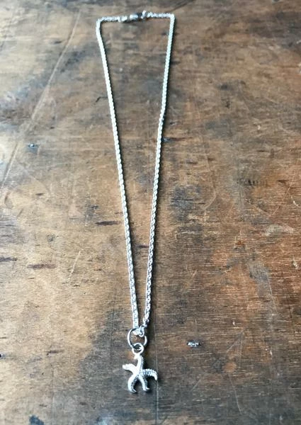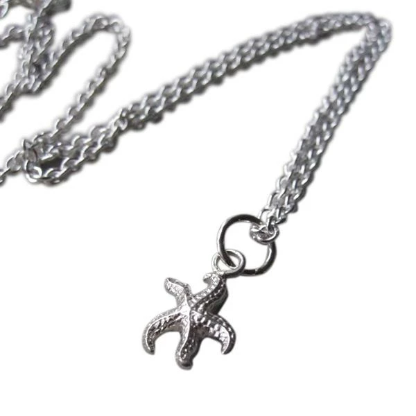 Small delicate silver starfish pendant on a silver chain. Memories of the sea and sandy beaches.