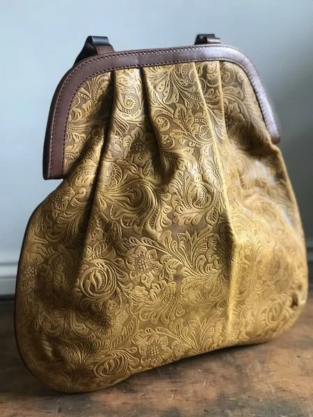 CollardManson Anya leather bag with shoulder strap – Tan floral embossed leather Inner zipped pocket Black shoulder strap. Dimensions approx. 35cm x 37cm.