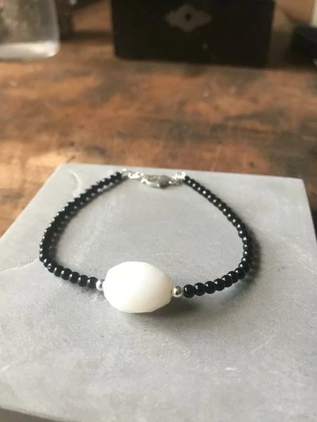 A droplet of rainbow moonstone and small polished black onyx beads. 925 silver. Length: 19-22cm (adjustable).