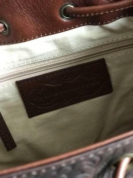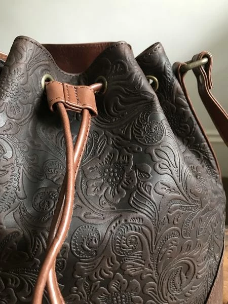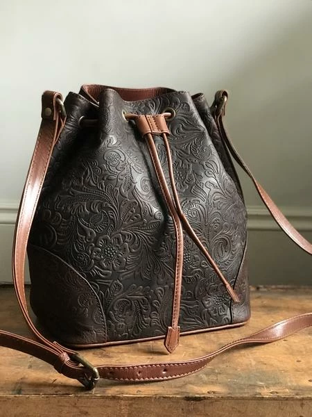 Bucket Bag- Brown floral embossed Leather – plenty of room for daily essentials. Inner zip and slip pocket Measurements: H:27cm W: 25cm D: 15cm.