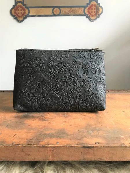 Leather Pouch in floral black leather. The leather pouch securely fastens with a zip closure. Lovely bag for keeping small items. Perfect gift. Available in premium leathers Tan floral , black floral leather and a deep brown floral leather. The bag offers a spacious design to carry your daytime or weekend necessities. This small bag can be used for anything you want it to. Use it as a small clutch when you are going out, it is especially good for storing your phone and cardholder on a night out, or as an easy and practical way of carrying your passport and other important documents and papers close by when travelling. Made in Leather Dimensions H:15cm x W:25cm x D:4.5cm.