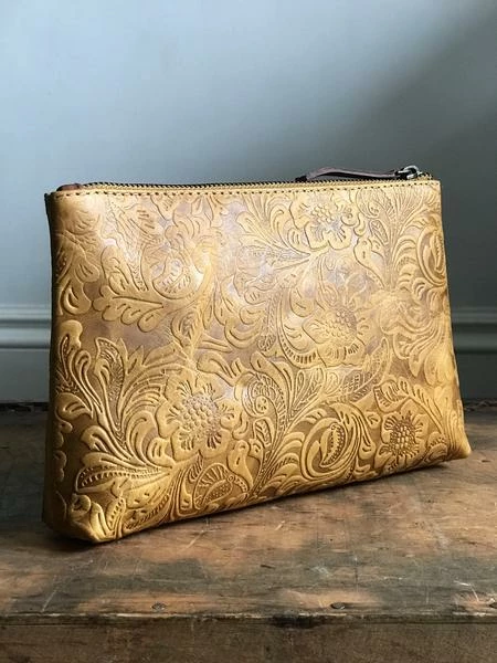 Leather Pouch in floral tan. The leather pouch securely fastens with a zip closure. Lovely bag for keeping small items. Perfect gift. Available in premium leathers Tan floral , black floral leather and a deep brown floral leather. The bag offers a spacious design to carry your daytime or weekend necessities. This small bag can be used for anything you want it to. Use it as a small clutch when you are going out, it is especially good for storing your phone and cardholder on a night out, or as an easy and practical way of carrying your passport and other important documents and papers close by when travelling. Made in Leather Dimensions H:15cm x W:25cm x D:4.5cm.
