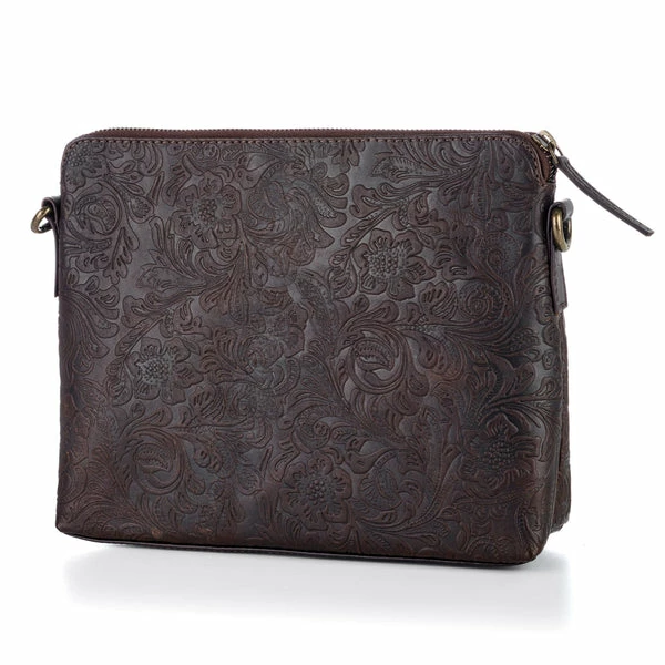 IN BROWN FLORAL LEATHER THIS UNISEX BAG COMES WITH AN ADJUSTABLE WIDE COTTON SHOULDER STRAP. INSIDE IS A ZIP POCKET AND COTTON LINING. WE THINK IT’S PERFECT FOR ESSENTIALS. Larger than the Elsie. The CollardManson largest purses and wallets fit perfectly inside the Florrie. Dimensions 28cm width, 21cm height, 6cm wide at the base.