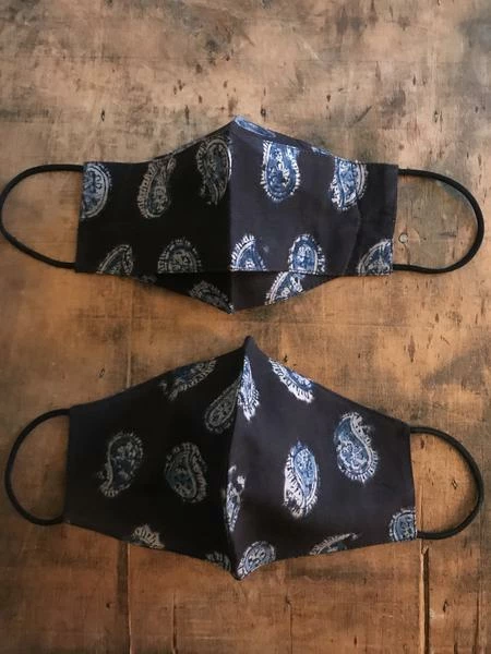 Block printed 100 % cotton masks with elastic ear loops. Pack of 2 styles. Machine wash. Approx. size from end to end of elastic 29-38cm NON RETURNABLE for hygiene reasons.