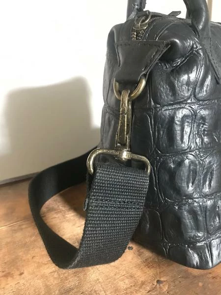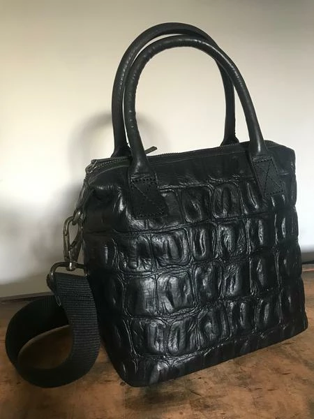 Maya Bag- Black croc Leather This beautiful croc textured leather bag is both practical and timeless. Inside is secure with a brass metal zip, cotton lining, one inner slip pocket, and an adjustable should strap. Dimensions H:22cm x W:23cm (widest part) x D:16cm approx.