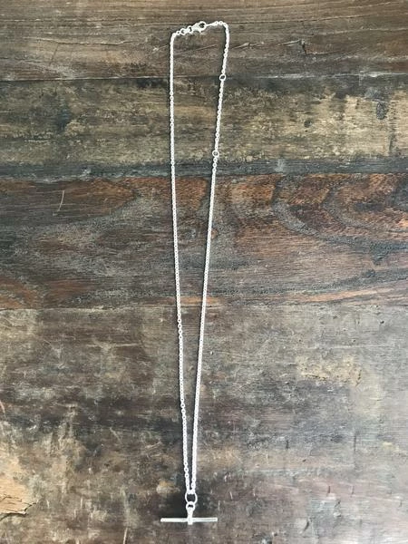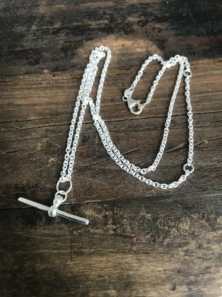 925 polished silver T-bar on a silver chain. chain length approx 50-60cm Also shown with other chains sold separately.