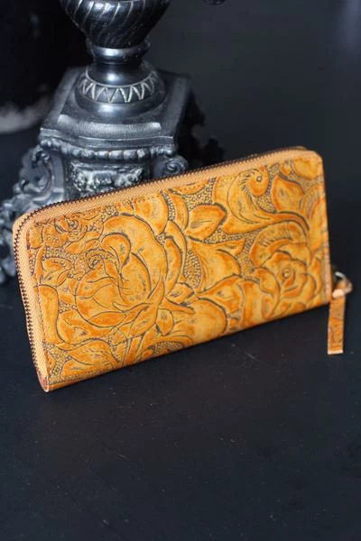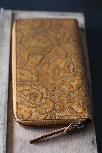 Tan floral wallet. This classic wallet in leather embossed with a floral pattern and features an inner zip compartment, eight card slots, and two pockets for notes. Italian embossed leather.
