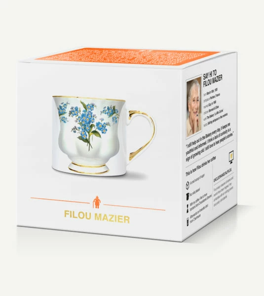 Diese einzigartige Tasse ist ein Treffen zwischen einer zeitgenössischen Porzellantasse und einer früheren. Es ist ein Symbol für das Treffen von Jung und Alt Es ist ein Symbol für das Treffen von Jung und Alt, das wir alle fördern sollten. Denn ob es deine Eltern, deine Großeltern oder diese alte Dame sind, die die Straße runter wohnt, sie alle haben wunderbare Geschichten und Lektionen, die sie uns beibringen können. Das macht dies zu einem auffälligen Design. Classic kommt nie aus der Mode! FILOU MAZIER geboren am 18. März 1939 Geburtsort Poitiers, Frankreich verheiratet Guy in 1960 Kinder Bernard & Elise arbeiten Die Bäckerei ‘La Mie Caline’ Hobby Verkauf von Antiquitäten auf Flohmärkten “Ich helfe immer noch jeden Tag in der Bäckerei, es hält mich jugendlich und informiert. Ich denke, ein Mangel an Neugier ist ein Zeichen dafür, alt zu werden. Ich liebe es immer noch, die Geschichten der Menschen zu hören”.