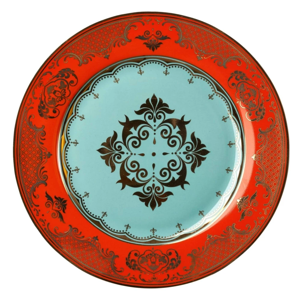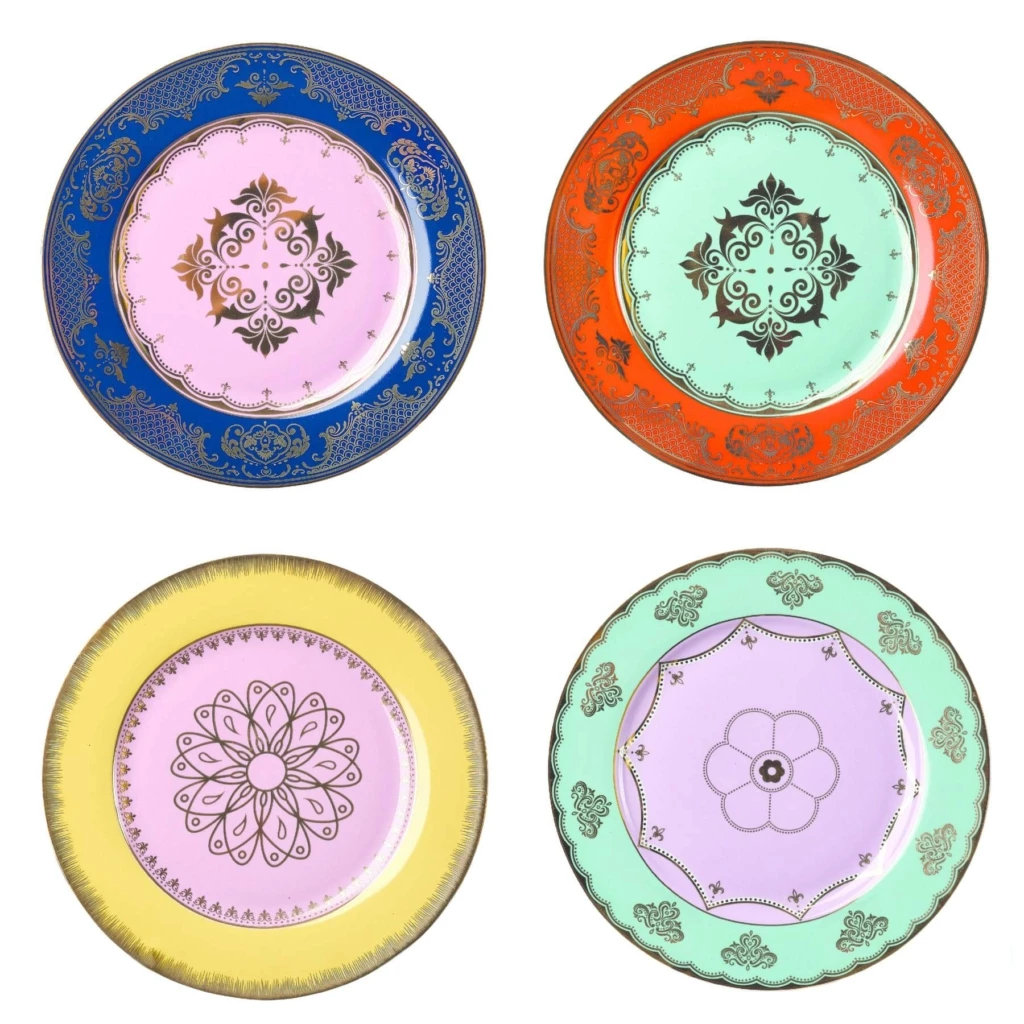 The plates are made of porcelain and feature traditional designs in bright colors and gold patterns. With these bright colors they add joy when it comes to taking that sacher cake.