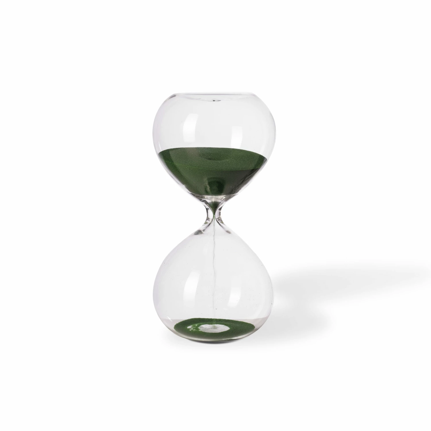 Transparent glass hourglass with green sand.