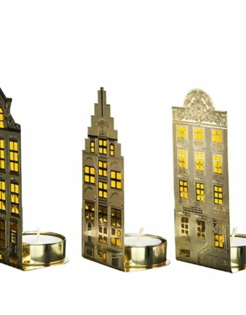 Tea light holders from Pols Potten, made of metal with a gold-colored finish and yellow diamonds. This set consists of three different designs, inspired by Amsterdam canal houses. The tea light holders spread atmospheric light through the openwork windows. The set comes with three tea lights.