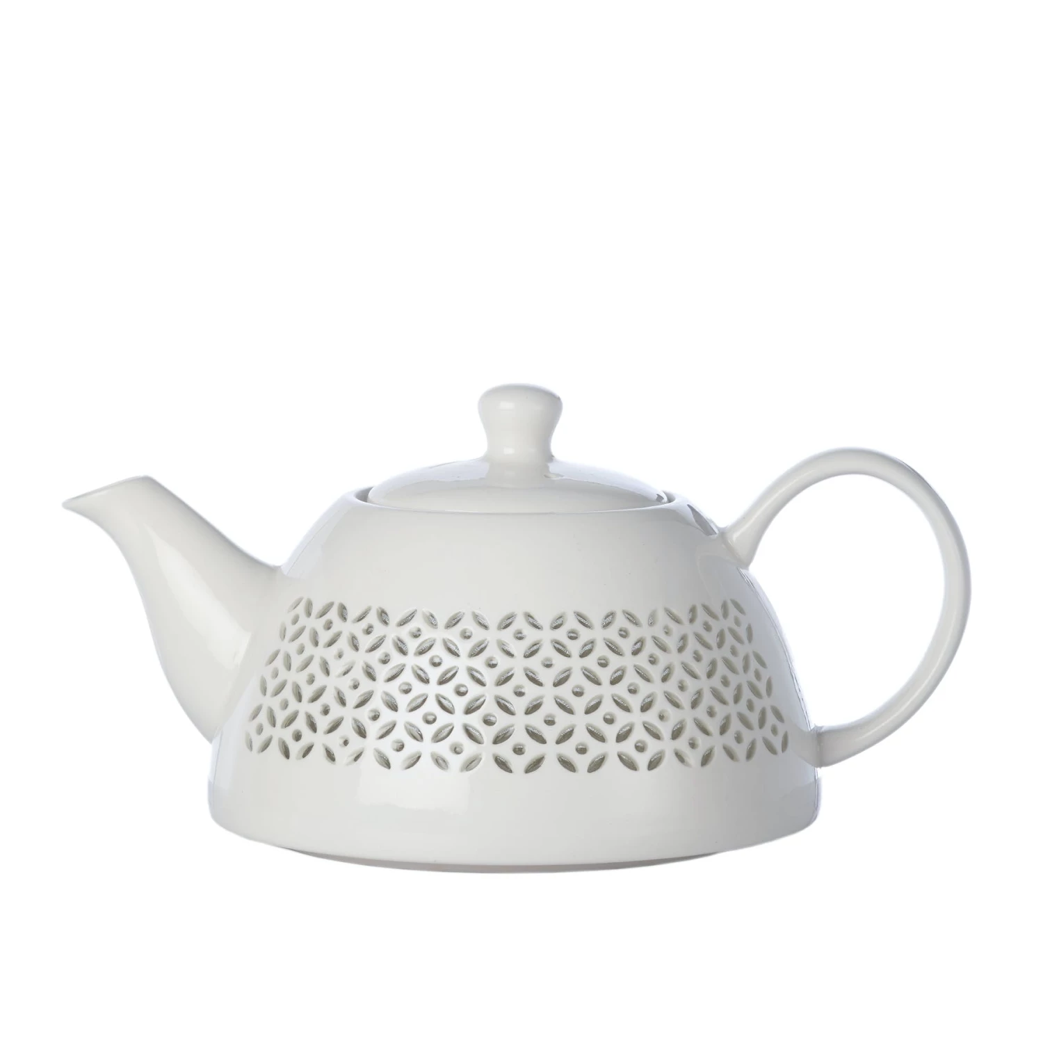 Perforated teapot. Made of porcelain, this teapot has a perforated shape pattern on the surface that has been filled with glaze to create a unique translucent look. Great for afternoon tea, more items are available in the collection to set any table in style.