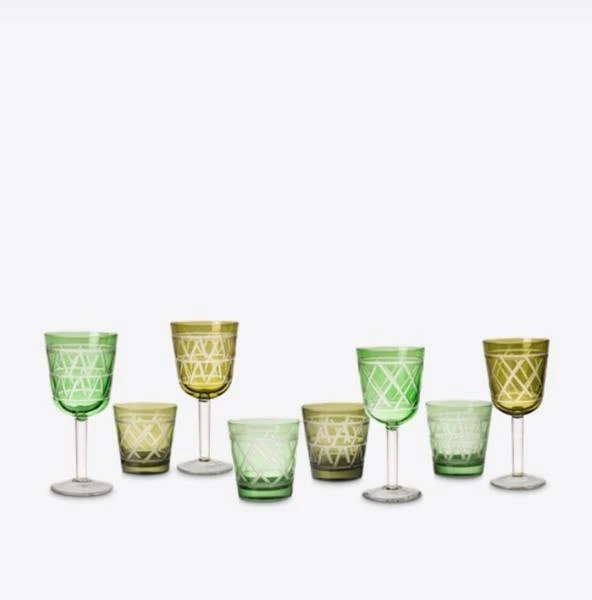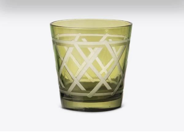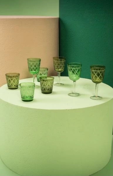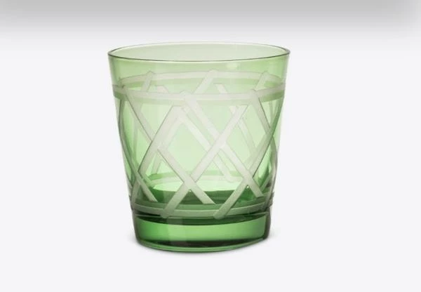 Diese Gläser sind mit akribischen Details gestaltet. Jedes Glas ist einzeln 3D-sandgestrahlt und mit einem komplizierten Kreuzmuster versehen, um den Überlappungseffekt zu erzielen. Material: 2 Farben aus farbigem Glas mit 2 verschiedenen sandgestrahlten Mustern Größe: Ø8 x 8,5 cm pro Glas