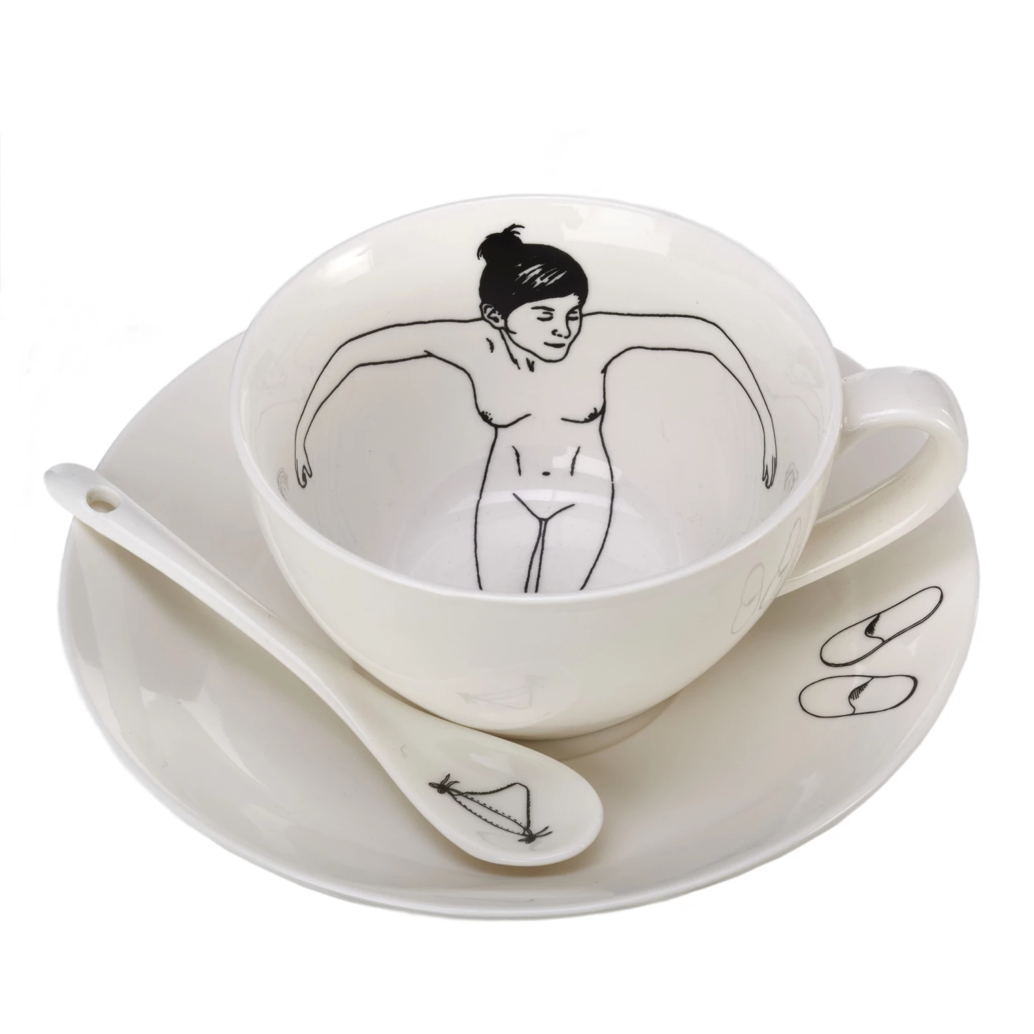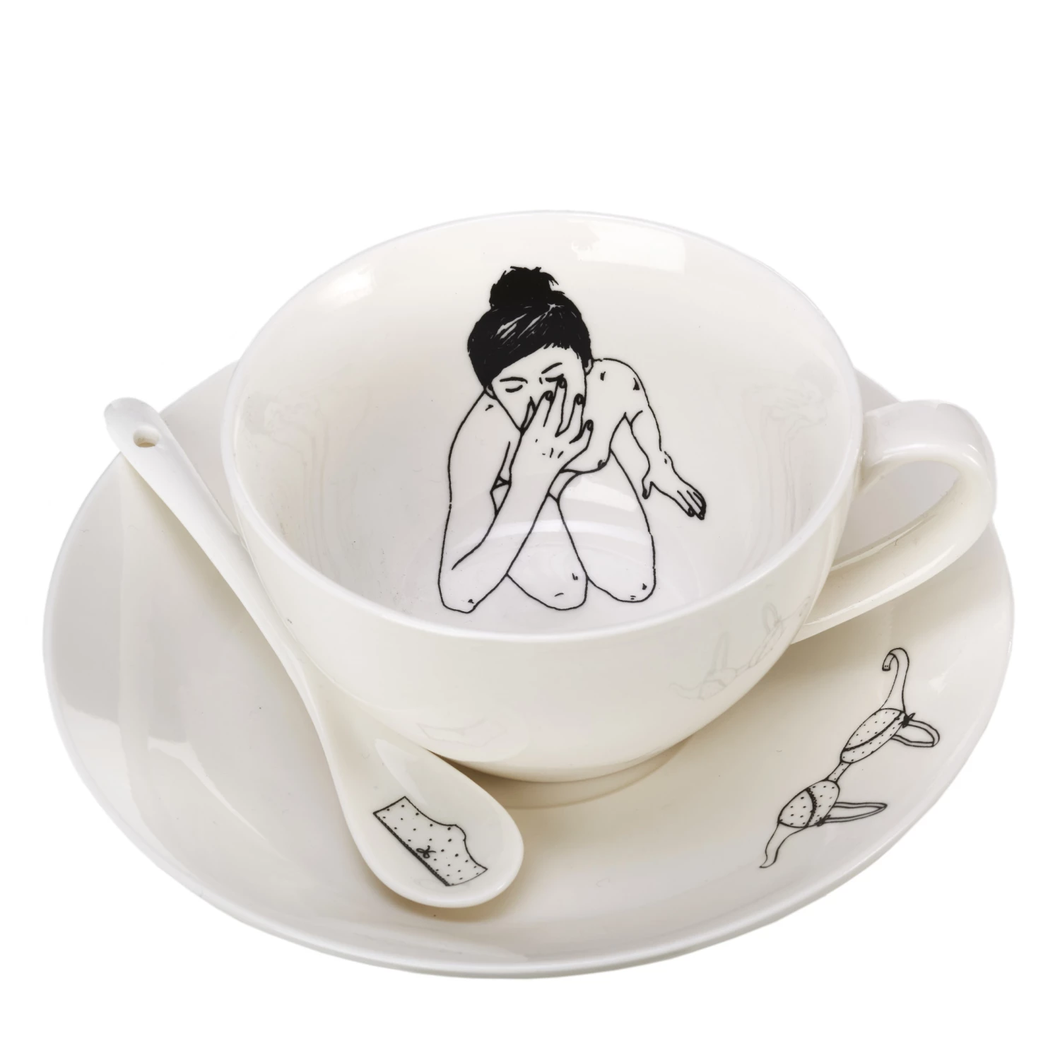 THE STORY The undressed tea set is one of a kind and made in collaboration with artist Esther Hrchner. Her delicate artwork is hand-drawn with a soft pencil and fine liner. She did like to express her love for quirky details and hidden pleasantry in drawing the bathing ladies inside of teacups and teapots. We bet your teatime has never been so naked.White glazed porcelain with transfer decoration – 4 cups, saucers and spoons Product dimensions: 10 x H6 cm Capacity: 220 ml per cup Packaging: gift box Design: Esther Horchner Dishwasher safe