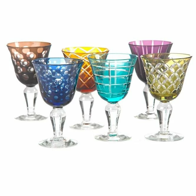 6 verschiedene Farben & Musterfür fröhliche FesteFarbtupfer auf Ihrem TischUnd alles ist erleuchtet: Juwelen aus buntem Glas.6er Set Gläser mit verschiedenen Schliffmotiven und verschiedenen Farben.Im Wein liegt nicht nur die Wahrheit, sondern hier liegtder Wein auch gut in der Hand:Im Weingläserset mit dem Schliff! Die Gläser ergänzen schön neutrale Wassergläser und helles Porzellan und setzen so Akzente auf jeder Tafel. Spülmaschinengeeignet.